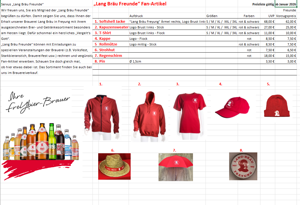 Jeder wahre Fan liebt und braucht sie: nützliche Fan-Artikel wie Jacken, T-Shirts oder Mützen in den Farben seiner Lieblings-Brauerei! „Lang Bräu Freunde“ können diese vergünstigt einkaufen. Schauen Sie doch gleich mal, ob hier etwas dabei ist. Das Sortiment finden Sie auch bei uns im Brauereiverkauf.